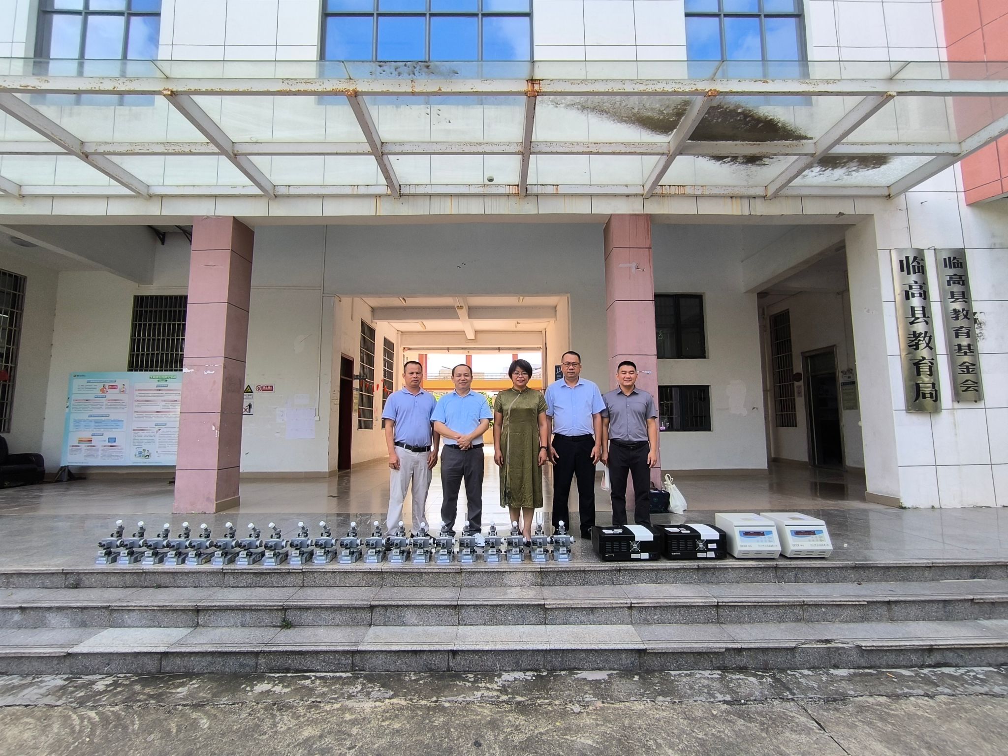 在永利集团实验室与设备管理处的大力支持下,yl7703永利集团劳邦盛、于雪玥老师作为校方代表,将总价值85,800元的2台离心机、2台紫外可见分光光度计及20台显微镜运送至临高县教育局。设备最终接收方美台中心学校和新盈中心学校代表共同参加仪式。
