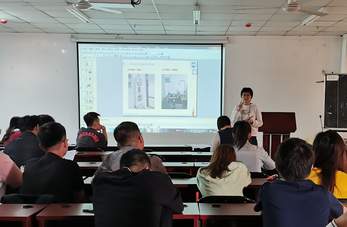 杨海峰主任对消防安全工作进行了培训,尤其是对实验室内消防器材的使用进行了详细讲解;海南省精细化工研究中心安全员李萌婷老师针对学院自查突出问题从化学品有序分类存放、五双管理、张贴二维码标签、废液区划分等方面做了整改要求。