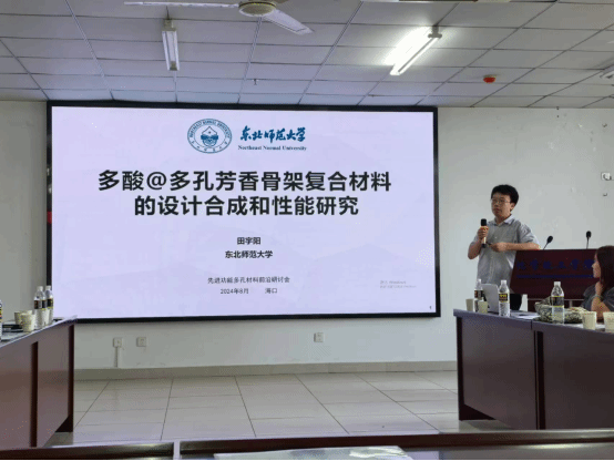 东北师范大学田宇阳教授则带来了题为“多酸@多孔芳香骨架复合材料的设计合成和性能研究”的报告。他从多孔芳香骨架(PAFs)的背景展开,介绍了基于离子型基块PAFs材料、基于多远构筑策略的PAFs材料以及离子型PAFs膜的成型制备三个方面的研究工作。