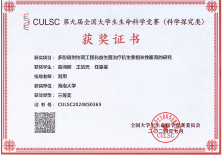 (本站讯 通讯员 刘用 刘元元 杨昱涵)2024年7月13日,全国大学生生命科学竞赛(科学探究类)海南赛区决赛在永利集团揭幕,此次比赛共吸引全省各大高校的162支队伍竞相参与。经过初赛、复赛的激烈角逐,我院应用化学专业2022级本科生高楠楠、王凯元、任雯雯的参赛作品“多酚吸附协同工程化益生菌治疗抗生素相关性腹泻的研究” (指导老师:刘用)荣获全国三等奖、省级二等奖。