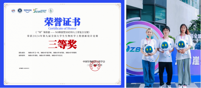 2024年7月22日至26日,第九届全国大学生生物医学工程创新设计竞赛在三亚崖州湾科技城盛大开幕。经过层层选拔,来自清华大学、北京大学、浙江大学、上海交通大学、东南大学等250所高校的近万名学子,共2000余个项目齐聚自贸港,围绕生物医学前沿议题同台竞技。经过预赛评选,我院共三件作品进入复赛,分别是:化学工程与工艺专业2022级本科生王一鸣、苗子卿、徐可歆、李璟琇的参赛作品“‘印’领骨愈—NO释放型3D打印人工骨复合支架”(指导老师:周阳,刘萌萌,刘元元);应用化学专业2021级本科生王凯元、任雯雯、高楠楠的参赛作品“组织粘附原位凝胶化的高分子贴片设计与医疗应用”(指导老师:刘用);2023级硕士生王怡、李昊和化学工程与工艺2020级本科生张畅泽的参赛作品“慧眼识珠——革新型人工肺氧合膜材料的智能筛选与工艺探索”(指导老师:杨昱涵,刘亚楠)。经过复赛的作品评审、项目路演和答辩汇报等多个环节,最终“‘印’领骨愈—NO释放型3D打印人工骨复合支架”(指导老师:周阳,刘萌萌,刘元元)和“组织粘附原位凝胶化的高分子贴片设计与医疗应用”(指导老师:刘用)两件作品均获得全国三等奖。本次由永利集团承办的第九届全国大学生生物医学工程创新设计竞赛是竞赛历史上参赛人数规模最大、赛程最长的一次竞赛活动。