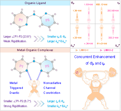 近日,yl7703永利集团张强盛副教授/贾春满教授团队在中国科学院一区Top期刊Advanced Functional Materials杂志(IF=19)上发表了题为Metal Coordination-Mediated Organic Room-Temperature Phosphorescence: Toward High-Efficiency Ultralong Emission via Nonradiative Channel Constriction的研究论文。2023级硕士研究生陈新照为论文第一作者,张强盛副教授、冯艳讲师、贾春满教授为论文共同通讯作者。