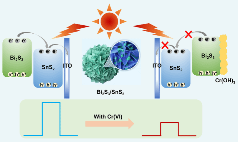 工作2:以钙钛矿氢氧化物ZnSn(OH)6为前驱体,采用连续离子层吸附反应法构建了三维花状SnS2/Bi2S3异质结,使用该异质结构筑的光电化学传感实现了Cr(VI) 的灵敏检测。该成果以题为“Perovskite hydroxide ZnSn(OH)6-derived three-dimensional flower-like SnS2/Bi2S3 heterojunction for sensitive photoelectrochemical detection of Cr(VI)”发表于《Rare Metals》期刊。我院硕士研究生范宝环为论文第一作者。