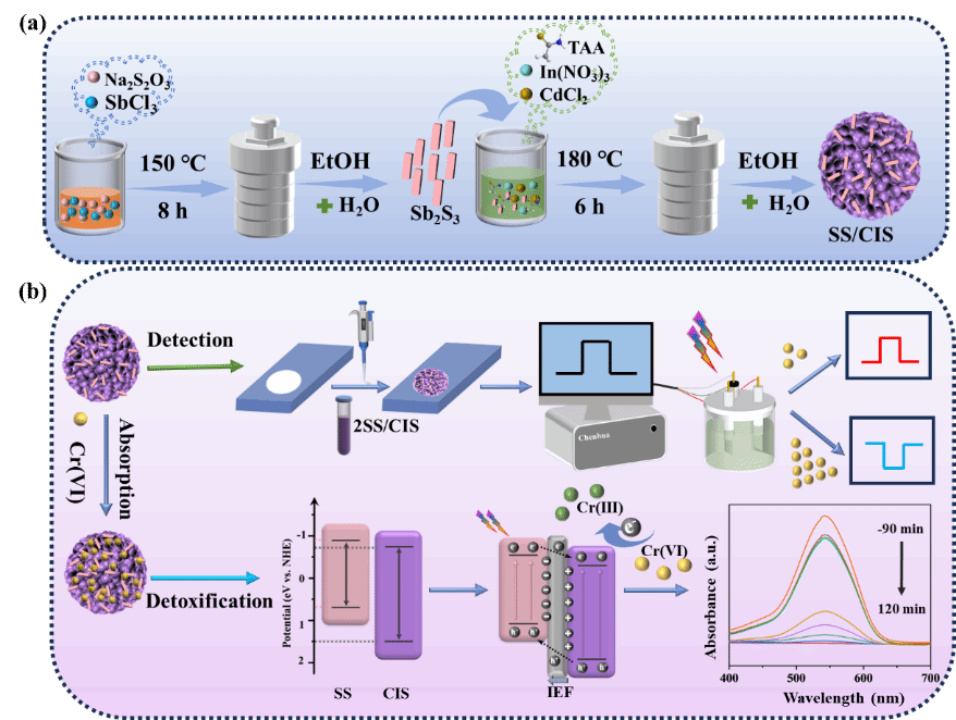 工作1:设计合成了一种双功能Sb2S3/CdIn2S4 p-n异质结,同时实现了Cr(VI)的光电化学灵敏检测和光催化解毒。所制备的光电化学传感器在稳定性、选择性和重现性方面均达到实用水平,在环境领域展现出重要应用潜力。该成果以“Difunctional Sb2S3/CdIn2S4 p-n Heterojunction: A Novel Material for Ultra-Wide-Range Photoelectrochemical Sensor with Photocurrent-Polarity Switching and Photocatalytic Detoxification of Cr(VI)”为题发表于《Chemical Engineering Journal》期刊。我院博士研究生蔺兆鑫为论文的第一作者。