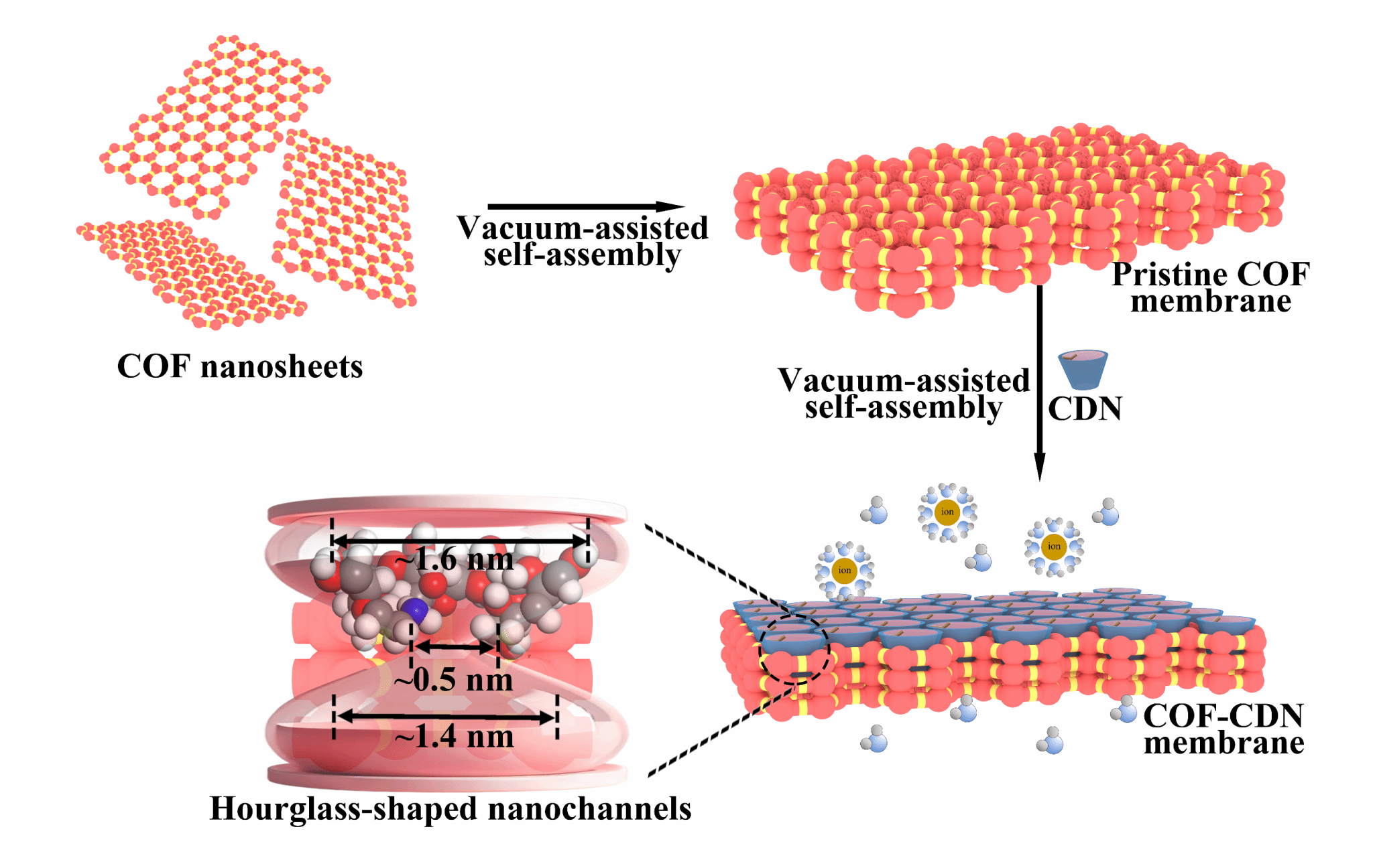 为了解决这一问题,永利集团/天津大学姜忠义、永利集团刘亚楠团队设计将氨基环糊精纳米颗粒组装到COF膜上,制备出一种具有沙漏形纳米通道的COF膜,用于实现超快脱盐。相关工作以“Covalent organic framework membrane with hourglass-shaped nanochannels for ultrafast desalination”发表在Nature Communications上。本文第一作者为yl7703永利集团2021级博士生,姜忠义教授和刘亚楠教授为共同通讯作者。