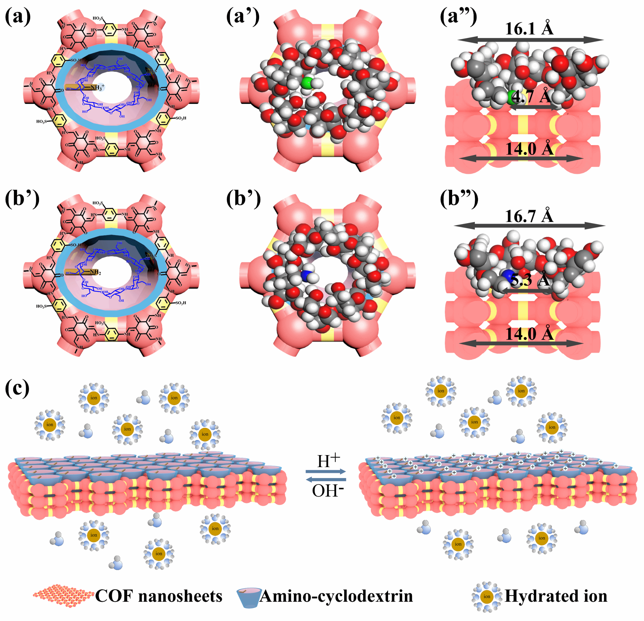 同时,氨基环糊精上的氨基基团赋予纳米通道pH响应性,通过可逆质子化/去质子化动态调节有效孔径与表面电荷(图2-3)。所制备的膜兼具高水通量与高盐截留率,并表现出高长周期稳定性与pH循环耐久性。该研究有望为构建COF膜的纳米通道提供新思路,从而在多类化学分离中缓解渗透性—选择性的制约。
