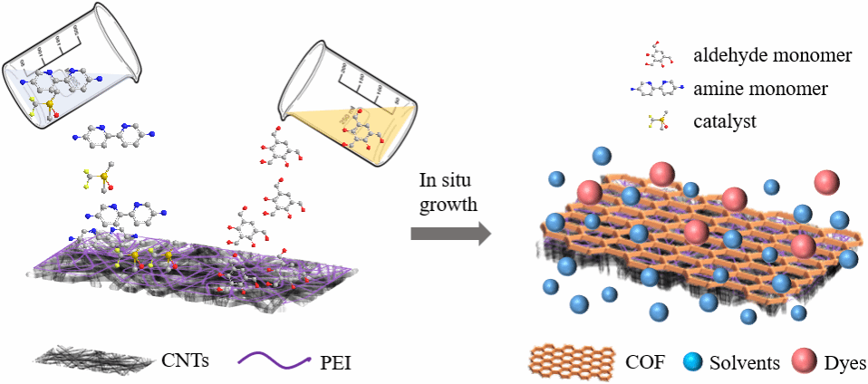 共价有机框架(COF)膜的结晶度是影响其选择性与渗透性能的关键因素。高结晶度的COF膜通常具有规整且贯通的纳米孔道结构,有助于实现精准筛分和快速传质。然而,目前合成具有明确结构和高结晶度的COF材料仍面临较大挑战。在有机溶剂纳滤(OSN)膜应用中,亚胺连接型COF是一类常用材料,其通过多官能胺与醛之间的可逆反应构筑。该反应初期通常生成无定形网络,随后逐步重排为有序的晶态多孔结构。因此,多数COF材料实际同时存在结晶区域与无定形区域。为提高亚胺类COF的结晶度,研究者已开发出多种策略,包括减缓单体添加速率、优化催化体系以及引入调节剂等。