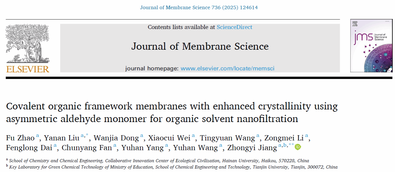 近日,姜忠义教授课题组在期刊《Journal of Membrane Science》(IF = 9.0)发表题为“Covalent organic framework membranes with enhanced crystallinity using asymmetric aldehyde monomer for organic solvent nanofiltration”的研究论文。教育部讲座教授姜忠义教授、永利集团刘亚楠教授为论文共同通讯作者。