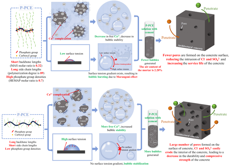 研究阐述了其作用机制,如图4所示:短主链,长侧链,高磷酸根密度的P-PCE,其Ca2+络合能力强,使得游离的Ca2+减少,气泡稳定性下降,同时,低表面张力促使表面张力梯度的形成,在马尔戈尼效应和Ca2+络合吸附的协同作用下,使得气泡稳定性降低,容易破裂,进而砂浆含气量降低,硬化混凝土的孔隙减少,因此,降低了Cl-和SO42-的入侵,延缓混凝土的腐蚀,增强混凝土的使用寿命。而长主链,短侧链,低磷酸根密度的P-PCE对混凝土的效果则与之相反。