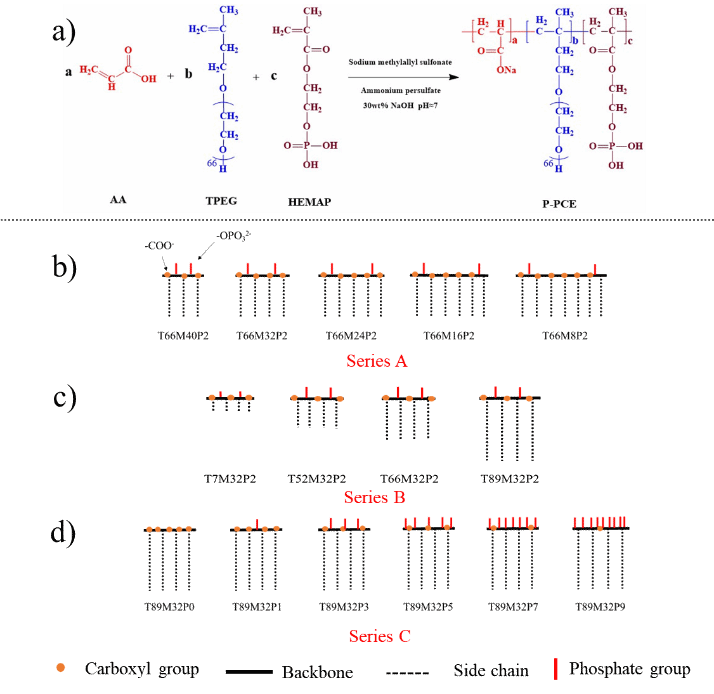 鉴于此,yl7703永利集团潘莉莎教授团队提出 “络合吸附-马兰戈尼效应” 策略,引入2-羟乙基甲基丙烯酸酯磷酸酯(HEMAP)作为功能消泡单体,经过水溶液自由基聚合成功合成低引气型聚羧酸减水剂(P-PCE),并通过调节聚醚大单体的聚合度以及甲基丙烯磺酸钠(MAS)和HEMAP的摩尔比对P-PCE的主链长度、侧链长度和磷酸根密度进行调控,其反应方程式和结构示意图如图3所示。