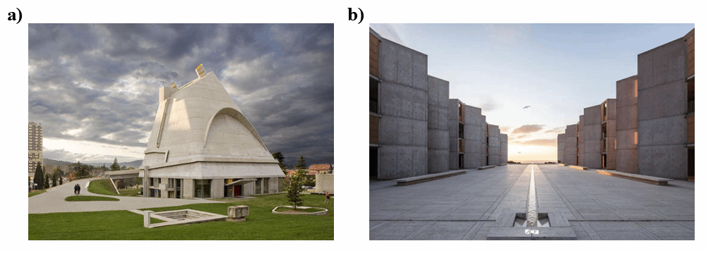 图1 著名清水混凝土建筑 a) 法国圣皮埃尔教堂 b) 美国萨尔克生物研究所