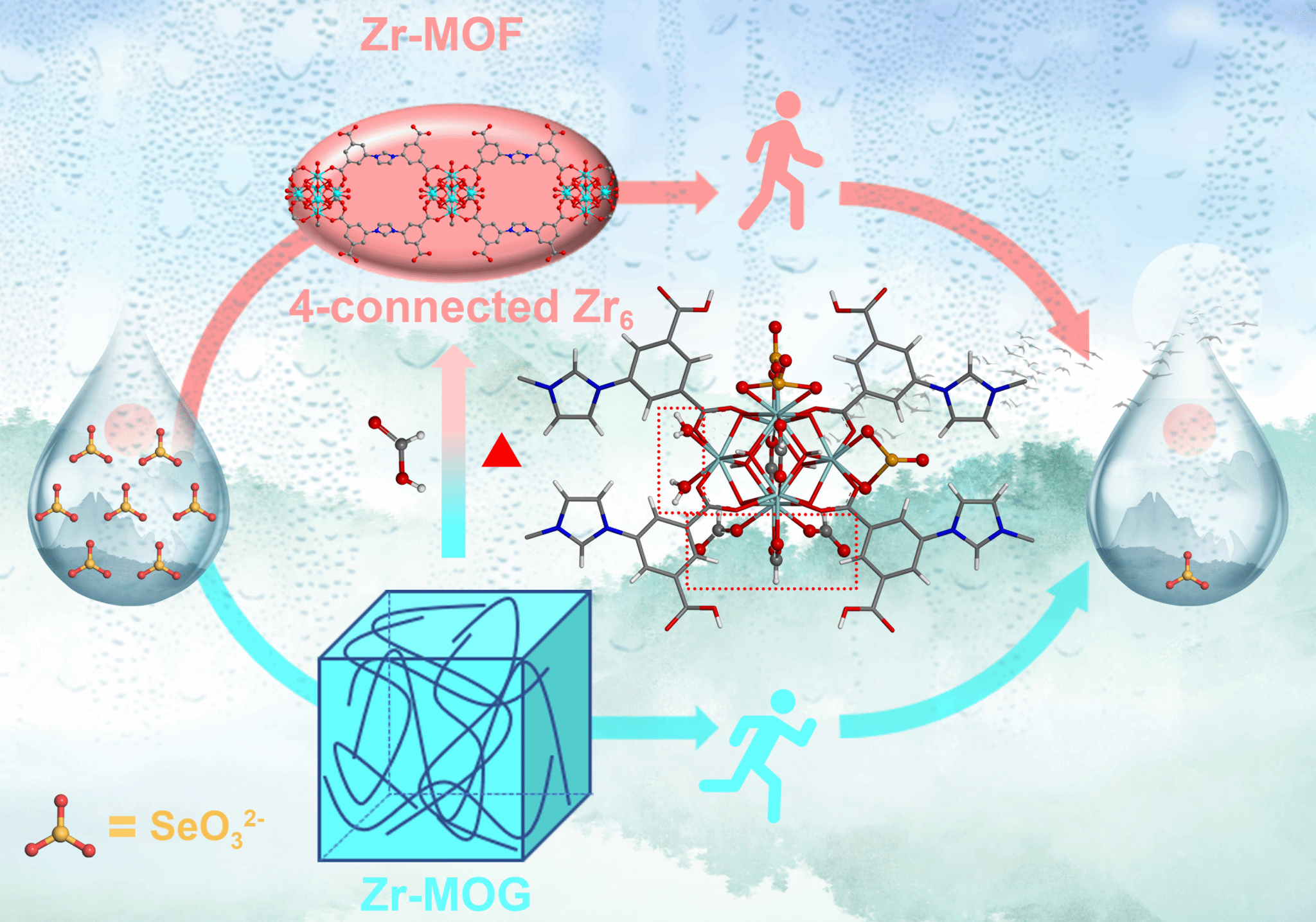 近日,yl7703永利集团先进功能多孔材料团队在水环境Se(IV)污染物高效去除领域取得新进展。团队基于Zr6簇的不饱和开放位点,成功设计并合成了对Se(IV)具有高吸附量的4-连接Zr-MOF(HNU-88)。其中间体的金属有机凝胶材料(HNU-G8),实现了对水环境水体中Se(IV)的快速吸附去除。相关研究成果以“Unlocking open metal sites in Zr-MOF/MOG for efficient and rapid Se(IV) adsorption”为题发表于期刊《Science China Chemistry》(中国科学院一区Top,IF=9.7),论文链接:http://engine.scichina.com/doi/10.1007/s11426-026-3401-3。博士研究生周琪为论文第一作者,任国建副教授和潘勤鹤教授为论文共同通讯作者。