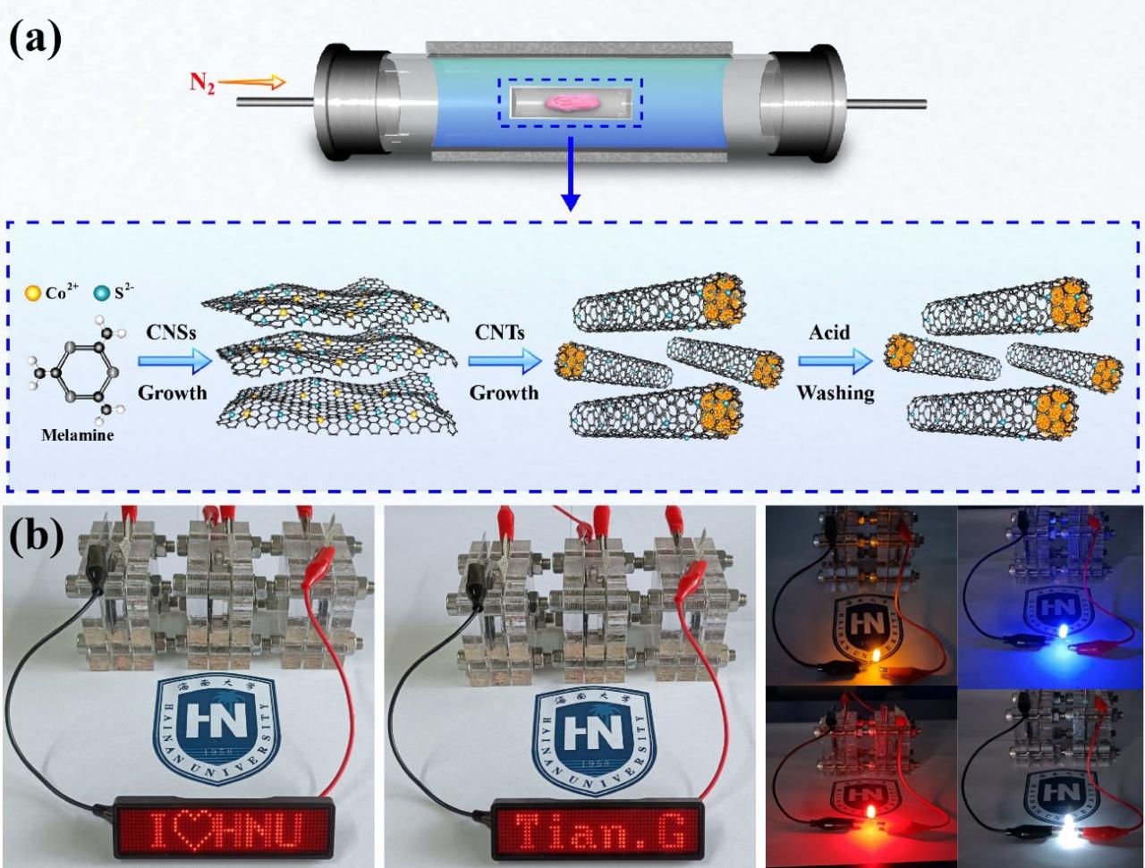近期,田新龙和沈义俊教授团队提出了采用简单的一步热解法结合酸洗处理的简易制备方法合成了一种具有独特三维结构的S,N共掺杂碳纳米管包覆Co纳米粒子氧还原(ORR)和氧析出(OER)双功能电催化剂,其独特的碳包覆结构有效的抑制了催化剂金属纳米粒子在苛刻的反应环境中的溶解和团聚现象。研究结果表明,所制备的催化剂材料具有优异的ORR和OER双功能电催化性能。其ORR半波电位高达0.874 V (vs. RHE),OER在10 mA cm-2下的过电势仅为274mV。与此同时,所制备材料还展现出优秀的稳定性,在经过超过5000圈加速老化实验后,其ORR与OER的性能保持稳定。此外,当所制备材料组装成膜电极应用于锌空气电池时,所组装电池展现出较高的峰值功率密度(171mW cm-2)和优异的长时间充放电能力。