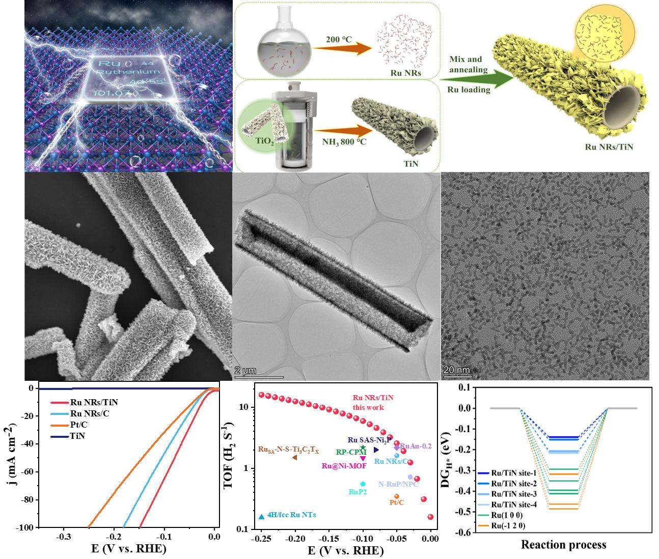 田新龙教授团队利用强金属-载体相互作用(SMSI)效应构建了一种钌纳米棒(Ru NRs)负载在多孔氮化钛(TiN)纳米片组装空心管(Ru NRs/TiN)的高效析氢催化剂。Ru NRs/TiN在1.0M KOH溶液中表现出出色的HER性能,仅需25 mV的过电位即可实现10 mA cm-2的析氢电流密度,并表现出超高质量活性(商业Pt/C的20倍)和优于大多数Ru基催化剂的氢周转频率。 密度泛函理论计算表明,SMSI可以在Ru-TiN界面引起显著的电荷再分布,提高催化剂的HER活性。此外,由于Ru物种和TiN载体之间的SMSI效应,催化剂表现出优异的稳定性。我们的工作扩大了Ru基HER催化剂的载体选择范围,并为SMSI的催化剂构建提供了新的见解。