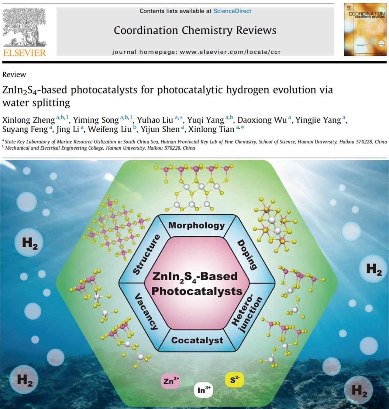 近期,田新龙教授团队撰写的《ZnIn2S4-Based Photocatalysts for Photocatalytic Hydrogen Evolution via Water Splitting》综述论文在化学领域Top期刊Coordination Chemistry Reviews(IF = 24.883)上发表。化学工程与技术学院2022级博士生郑馨龙为论文第一作者,刘雨昊副教授、田新龙教授为论文共同通讯作者。