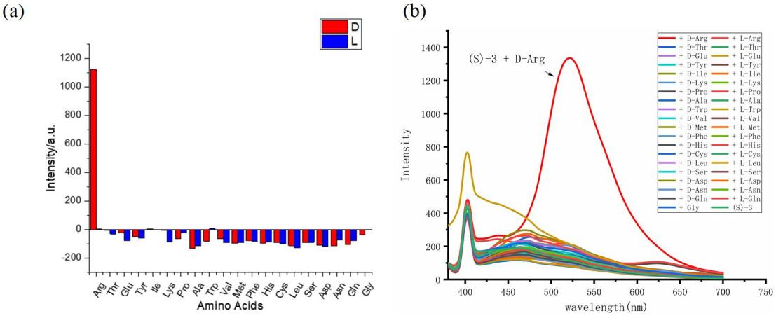 作者使用DMSO作为溶剂研究了(S)-3对游离氨基酸的两种对映异构体的荧光响应。通过(S)-3与6当量氨基酸在4mL DMSO中快速反应,以2.0×10-5 M的固定浓度进行荧光测试,并记录λ= 525 nm处峰值强度的荧光数据。结果表明,当(S)-3用大多数氨基酸及其对映异构体处理时,仅观察到非常微弱的荧光增强。然而,D-Arg却极大地增强了(S)-3在λ= 525 nm处的荧光强度。并且,发现其强度比L-Arg高528%,对映选择性荧光增强比高达487。