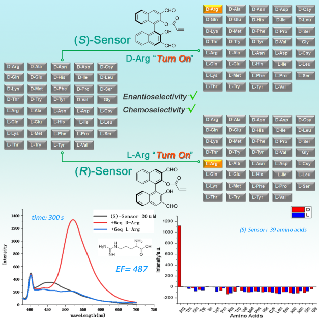 近日永利集团曾潮元课题组在Cell Press细胞出版社旗下期刊iScience上发表了论文(iScience [J], 2022, 25, 104964;并被X-MOL学术资讯作为亮点介绍;https://mp.weixin.qq.com/s/dGCAuypkNPgIp6kcBIbNuw)。提出了在手性1,1'-联-2,2'-萘酚(BINOL)上引入丙烯酸酯,构建BINOL双醛单丙烯酸酯多位点荧光探针的策略,实现了在39种氨基酸中5分钟内对D-精氨酸(D-Arg)的专一选择性荧光检测,其检测D-Arg时ef值(对映选择性荧光增强比)高达487,这是目前报道的首例无需金属离子、对D-Arg同时具备对映选择性和化学选择性的手性荧光探针。永利集团化学工程与技术学院2022级博士研究生余贤哲为论文第一作者。