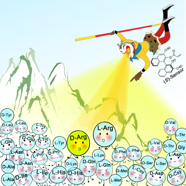 除甘氨酸外,所有的氨基酸都有手性,分为L型和D型。由于人体内L-氨基酸的总量远高于D-氨基酸,导致D-氨基酸的存在和生理作用往往被忽视。随着研究的深入,人们发现,神经信号传递、衰老、一些重大疾病(例如:阿尔茨海默症、动脉粥样硬化、乳腺癌等)等都与D-氨基酸存在密切联系。因此,D-氨基酸的精准识别对研究其生理功能、监测人体健康具有重要意义。但因为D-和L-氨基酸互为对映异构体,且各种氨基酸之间的结构非常相似,实现特定氨基酸的专一选择性检测非常困难。