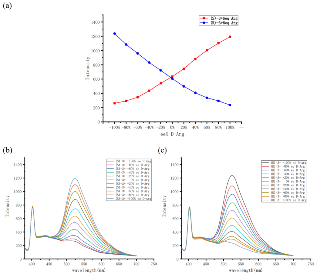 作者研究了Arg溶液在不同对映体过量(ee = [D-L]/[D+L])下的荧光响应。研究结果显示,(S)-3和(R)-3的荧光响应呈现出近乎镜像的关系。这项Arg的ee值研究进一步证实了探针的对映选择性识别能力,以及检测溶液中Arg对映体组成的优势。