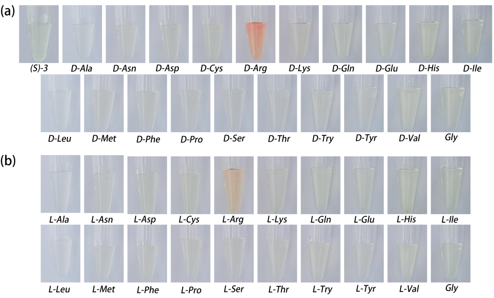 作者继续研究了探针对Arg的可视化检测性能,在加入D-Arg后,探针溶液(S)-3呈红色,而L-Arg使溶液变为浅棕色。其他氨基酸都没有显著改变探针溶液原本的颜色。基于上述现象,(S)-3与Arg之间的反应机制完全不同于其他氨基酸,在与Arg相互作用时,400-500 nm的强UV-Vis吸收导致溶液呈橙红色。