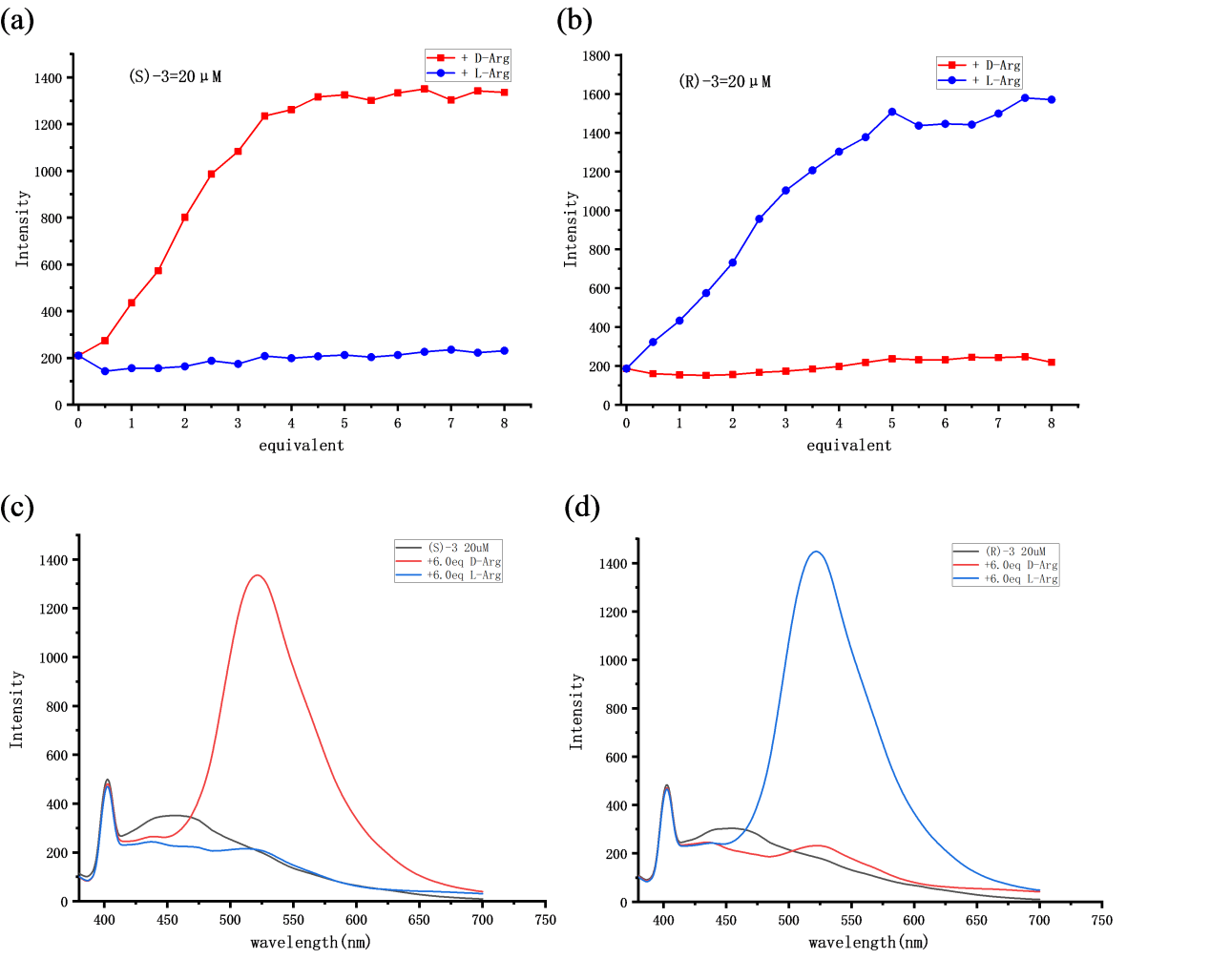 图3.手性荧光探针对Arg对映体的对映选择性荧光增强