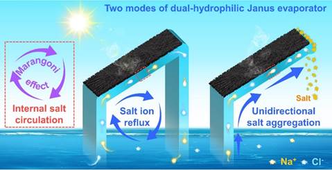 太阳能驱动的界面水蒸发系统为解决全球淡水资源危机提供了一种绿色、环保、可持续的技术方案。然而,目前大多数蒸发器存在成本较高、光热转换效率较低和抗盐能力差等问题,难以实现技术的实用化。探索具有低成本、高能量转换效率、可扩展以及长效耐盐的界面蒸发系统对实现太阳能海水淡化系统的广泛应用至关重要。团队采用静电纺丝膜(Mo2C-C@PAN)作为顶部蒸发层,无纺布(NW)作为底部供水层,构建一种双亲水性Janus结构蒸发器,并结合倾斜隔离结构,实现长期高效水蒸发和灵活的盐处理。所构建的倾斜式Janus蒸发器可以在一个太阳光下实现~260 g m-2d-1的高效采盐。本研究为双亲水Janus蒸发器长期、高效、协同提取淡水和矿物盐资源提供了新的可能性。(Chemical Engineering Journal, 2023, 461, 141954)