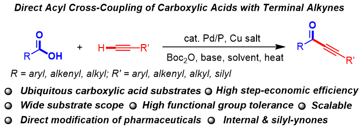 近日,陈铁桥教授团队在中科院一区Top期刊《ACS Catalysis》(IF = 13.7)发表题为“Pd/Cu-Catalyzed Synthesis of Internal and Sila-Ynones by Direct Selective Acyl Sonogashira Cross-Coupling of Carboxylic Acids with Terminal Alkynes”的研究论文,永利集团2019级硕士研究生刘雪为论文第一作者,美国罗格斯大学Michal Szostak教授与永利集团陈铁桥教授为论文的通讯作者。