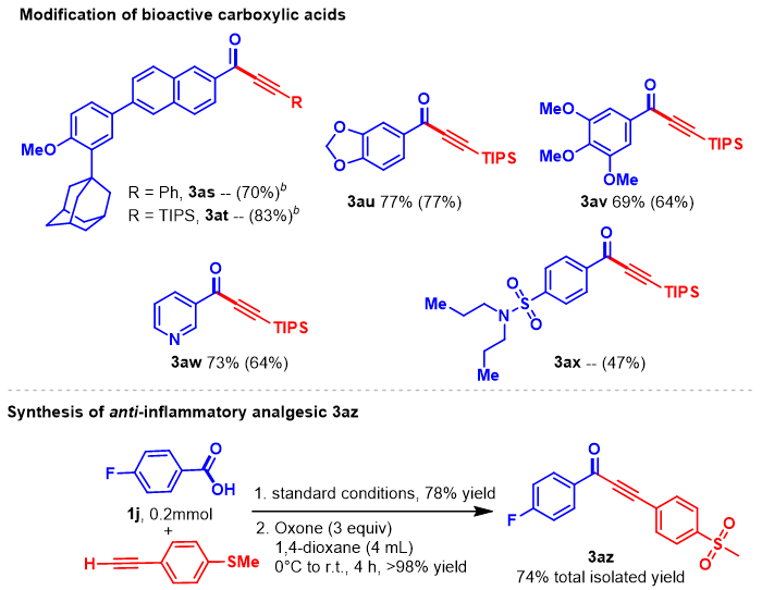 羧酸来源广泛,廉价易得,具有稳定、低毒、易储藏等特点,被广泛地应用于有机合成。陈铁桥教授团队利用Pd/Cu协同催化促进羧酸与末端炔烃发生酰基化的Sonogashira偶联,高效率地合成了炔酮化合物。研究发现,在氮气氛围下,以Pd(dppp)Cl2/ CuCl为催化剂, dppe为配体,NaHCO3为碱,酸酐(Boc)2O为羧酸的在线活化试剂,环己烷为溶剂,苯甲酸与苯乙炔在120 ℃的条件下反应12小时,能以94%的GC收率生成目标炔酮。与此同时,作者对反应的底物适用性展开了探索,芳香族和脂肪族羧酸都能与各种末端炔烃偶联,以良好至高的产率得到炔酮化合物。更重要的是,该反应可以应用于生物活性羧酸的直接修饰。阿达帕林是一种用于治疗痤疮、丘疹和脓疱的临床药物,这种药物可以很容易地与苯基乙炔和硅烷基乙炔发生反应,分别以70%和83%的收率生成目标化合物。胡椒酸、三甲氧基没食子酸和烟酸,也能以高产率得到预期产物。丙磺舒在临床上用于减轻尿酸盐结节的形成来减少关节损伤。虽然丙磺舒具有缺电子的特性,但在该策略下其能与硅烷基乙炔偶联生成目标产物。该反应条件可以用于抗炎镇痛剂药物的合成:将4-F苯甲酸与(4-乙基苯基)(甲基)磺胺偶联,然后再简单氧化,以74%的总产率得到相应功能分子。