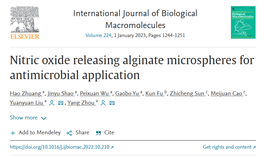 2023年1月1日,永利集团化学工程与技术学院周阳教授课题组在中科院1区国际权威Top期刊《International Journal of Biological Macromolecules》(影响因子:8.025)上发表了最新研究成果“Nitric oxide releasing alginate microspheres for antimicrobial application”( 释放一氧化氮的海藻酸盐微球在抗菌方面的应用)。永利集团为第一单位,永利集团2020级硕士研究生庄浩为论文的第一作者,周阳教授和刘元元副教授为论文的共同通讯作者。该工作获得了海南省自然科学基金、国家自然科学基金和永利集团科研启动基金的支持。