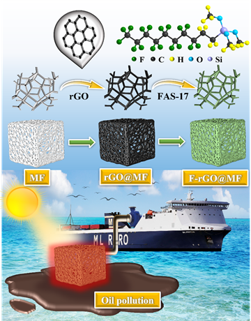 海上溢油事故频发,往往伴随着化学腐蚀性和复杂的作业环境,因此迫切需要能够高效吸油且性能稳定的新型吸油材料。此研究报道了一种经硅烷接枝改性的还原氧化石墨烯包覆三聚氰胺海绵(F-rGO@MF),它具有优异的超疏水/超亲油表面性能(WCA达157.7°),对多种油类具有较高的吸收能力(58.7-147.8g/g),并可进行多次吸收循环。油水混合物的分离效率高达99.32%,分离80次后分离效率仍可达97.48%。该吸收剂还能通过蠕动泵连续分离油水。此外,F-rGO@MF在强腐蚀环境下仍能保持漂浮性和化学稳定性。更重要的是,由于rGO的光热特性,在1.0 kw/m2 的光照强度下,F-rGO@MF 的表面温度可在225秒内迅速升至101℃,这有助于降低原油的粘度,并在7分钟内吸收了14.75克原油,为吸附高粘度溢油提供了可能。