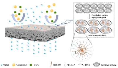 成果一题为“Engineering antifouling membrane with surface segregation agents bearing crosslinked low surface energy segments”。该研究以合成具有亲水链段和交联低表面能链段的两亲性表面偏析剂为基础,通过非溶剂诱导相分离的方法制备了抗污染超滤膜。在相分离过程中,亲水链段的表面偏析会将交联的低表面能链段拖到膜表面,而低表面能段的交联结构会影响相分离过程,形成松散的分离层。通过构建两亲性膜表面,协同提高膜的渗透通量和抗污染性能。这项工作可为低表面能表面偏析剂的设计及其在抗污染膜制备提供有价值的指导。