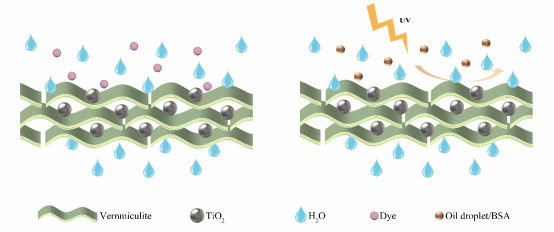 成果二题为“2D vermiculite nanofiltration membrane with TiO2 nanoparticles as versatile intercalator for enhanced water purification”。该成果以蛭石纳米片的高稳定性和亲水性为基础,结合TiO2纳米颗粒的光催化降解能力,构建了二维蛭石纳滤膜,实现了对有机污染物的高效去除。选择TiO2纳米颗粒作为多功能插层剂,不仅可以精确控制蛭石纳米片之间的层间距,还赋予膜光催化自清洁能力。研究结果表明,这些膜在水净化领域展现出良好的应用潜力。