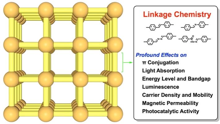 目前COFs由结点和单元通过缩聚反应形成特定的共价键。近年来随着研究的深入开发了不同的缩聚反应类型,使得构建具有不同链接的COFs成为可能,以最广为人知的肼、亚胺、氮杂环和C=C键为代表。尽管用这些最具代表性的链接建立的COFs的数量迅速增加,但链接化学在π电子结构的演变和功能的发展中的作用仍然是一个需要解决的关键基本问题。该研究报道了COFs的设计合成,其特征是四个代表性的链接:腙、亚胺、吖嗪和C=C键,以阐明它们对π电子结构和功能进化的影响。研究表明腙键提供了非共轭链接,而亚胺和吖嗪允许部分π共轭,C=C键完全π共轭。重要的是,这种联系深刻地影响了π电子结构和功能的控制,揭示了其在确定带隙、前沿能级、光吸收、发光、载流子密度和迁移率以及磁导率等关键电子性质中的关键作用。