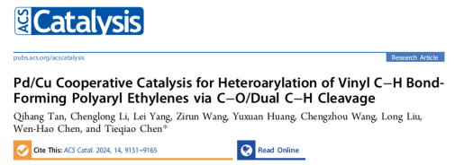 近日,陈铁桥教授团队在中国科学院一区Top期刊《ACS Catalysis》(IF = 12.9)发表题“Pd/Cu Cooperative Catalysis for Heteroarylation of Vinyl C–H Bond Forming Polyaryl Ethylenes via C–O/Dual C–H Cleavage”的研究论文,永利集团2019级博士研究生谭启航为论文第一作者,陈铁桥教授为论文的通讯作者。