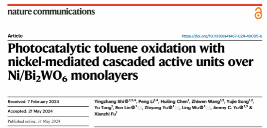 成果以“Photocatalytic toluene oxidation with nickel-mediated cascaded active units over Ni/Bi2WO6 monolayers”为题发表在Nature Communications上。论文第一作者为yl7703永利集团超薄二维材料的能源/环境可见光催化应用团队的时应章副研究员,通讯作者为福州大学能源与环境国家重点实验室林森教授、喻志阳研究员和吴棱教授。