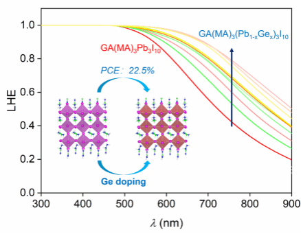 研究成果发表于国际著名期刊《Journal of Materials Chemistry A》(IF=10.7)上,题为“Germanium doping effect on the photoelectronic performance of alternating cations in the interlayer space GA(MA)3(Pb1−xGex)3I10”。第一作者为yl7703永利集团孙萍萍教授,通讯作者为yl7703永利集团迟伟杰教授、中国科学院过程工程研究所蔡贵龙研究员。yl7703永利集团为论文的第一单位。