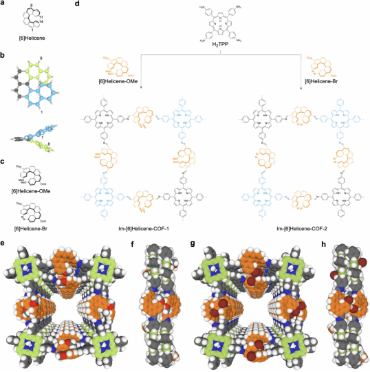 螺烯(Helicenes)作为一类具有独特折叠骨架的π共轭化合物,尽管其主链的结构变化范围很广,但如何将螺烯整合到聚合物主链中,构建结构明确的π结构是螺烯材料进展的关键。共价有机骨架(COFs)可以通过拓扑图进行分子设计,并通过聚合反应进行综合控制而形成结晶多孔聚合物,具有明确的多边形骨架和排列有序的孔。过去十年的化学进展极大地扩展了单体的范围,从简单的苯基衍生物到各种具有复杂骨架的π化合物。然而,探索将螺烯作为设计和构造COF的建筑单元及其性能研究仍有待进一步探索研究。