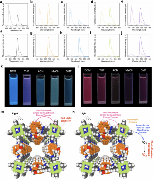 能源/环境材料精准设计和功能开发团队通过[6]螺烯与卟啉在溶剂热条件下拓扑定向聚合反应,所得的Im-[6]Helicene-COF-1和Im-[6]Helicene-COF-2 螺烯框架表现出二维层状结构,螺烯和卟啉单元呈交替连接,沿x和y方向的中心到中心距离为2 nm,同时通过反向反AA堆积沿z轴构成分离的[6]螺烯和卟啉柱状π阵列。这种π构型使得框架能够以基准量子产率高度红色发光,从[6]螺烯到卟啉的有效的框架内单重态到单重态能量转移,并促进从框架到分子氧的分子间三重态到三重态能量转移,以产生活性氧物质,收获从紫外到近红外区域的宽范围光子用于发光和光化学转化。该研究首次揭示了框架内单重态到单重态的能量转移和分子间三重态到三重态的能量转移,展示了捕光天线的发现揭示了COFs中的π单元通过电子通讯实现能量流动,可以利用广泛的光子进行有效的发光和光电化学转换,同时展示了一种将[6]螺烯整合到[6]螺烯COFs中的方法。这一成果揭示了[6]螺烯可以作为一种结构单元来开发具有明确结构的螺烯材料,对COFs和螺烯材料领域都有很大影响。