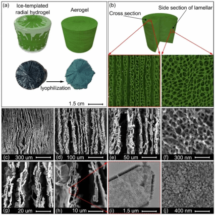 针对这一挑战,yl7703永利集团环境/能源材料先进制造与应用创新团队高艳安研究员、巫继锋副教授与厦门大学白华教授团队合作,设计了一种纯聚苯胺水凝胶(PPH)电极材料。该材料通过冰模板策略生成独特的辐射多孔状结构,实现了高效的电子传递和电解质扩散,成功桥接了超高质量负载和优越的速率能力这两个相互排斥的特性。PPH在43.2 mg/cm²的高质量负载下,实现了17.1 F/cm²的面积电容(在500 mA/cm²下)和优异的倍率性能(在20至500 mA/cm²间保持约94%的电容)。这项研究展示了多孔纳米结构在提高电极材料性能方面的潜力,并能激发其他具有超高负载和快速充放电能力的赝电容电极材料的发展。