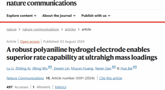 近日,我院环境/能源材料先进制造与应用创新团队与厦门大学白华教授合作,在《Nature Communications》上发表题为《A robust polyaniline hydrogel electrode enables superior rate capability at ultrahigh mass loadings》的研究论文。我院2021级硕士研究生李璐以及2022届硕士研究生艾智婷为论文第一作者。