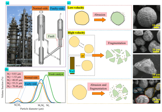 催化剂磨损是催化裂化(FCC)工艺中普遍存在的问题,严重的颗粒磨损将会威胁FCC装置的稳定运行。本研究讨论了某工业催化裂化装置汽提分布器故障,研究颗粒物性变化与故障源之间的联系。研究发现,颗粒的磨损破碎行为与故障源位置密切相关。催化剂扫描电镜(SEM)分析与粒度分布表明,催化剂颗粒在故障位置受到高速蒸汽的冲击发生破碎,颗粒碎片在流化和运输过程中进一步磨损。其中,待生催化剂位于故障源一侧,其主要磨损机制是破碎机制;而非故障侧的再生催化剂的主要磨损机制则是表面剥层磨损。此外,文章提出,用机械强度更强的平衡剂代替磨损的催化剂,可以降低装置内催化剂的磨损率,从而减轻催化剂跑损。本研究有助于更深入地了解工业FCC装置不同位置的颗粒磨损和破碎行为。对催化裂化装置催化剂跑损故障的诊断和运行调整提供了理论依据。