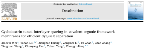近日,姜忠义教授课题组在国际工程技术一区Top期刊《Desalination》(IF = 8.3)发表题为《Cyclodextrin tuned interlayer spacing in covalent organic framework membranes for efficient dye/salt separation》的研究论文。姜忠义教授和刘亚楠教授为论文共同通讯作者。