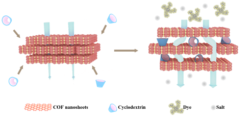 为了解决这一问题,永利集团姜忠义教授团队将环糊精(CD)作为插层剂,引入相邻的COF纳米片中,以增加COF膜的层间距,形成丰富的传质通道,从而实现高效的染料和盐分离(图1)。此外,CD与COF纳米片之间的相互作用可以增强膜在长期测试中的稳定性。