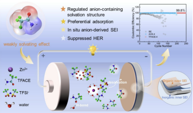 针对传统水系锌离子电池中锌枝晶生长和副反应频发的问题,团队创新提出氢键供体调控策略,开发出基于三氟乙酰胺(TFACE)的水合共晶电解液(HEEs)。该电解液通过弱溶剂化效应促使阴离子主导Zn²⁺配位,形成稳定的阴离子衍生SEI膜,有效抑制水分子与锌负极接触。实验表明,对称电池在0.5 mA·cm⁻²条件下实现2400小时超长稳定循环,库伦效率达99.8%。相关成果以“Weakly Solvating Effect Optimized Hydrated Eutectic Electrolyte towards Reliable Zinc Anode Interfacial Chemistry”为题发表于Journal of Colloid and Interface Science(DOI: 10.1016/j.jcis.2025.02.076, 第一作者是联合培养博士生徐心铭,通讯作者是苏龙副研究员、宁德时代王瀚森博士、高新培教授。