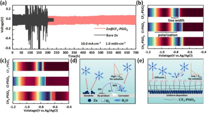 为解决传统水系电解液中SEI膜难以稳定构建的难题,团队开发了一系列功能化基团修饰的人工SEI层用以调控电解质/电极界面行为。首先,通过"两步自组装"技术构建一种自组装聚硅烷人工SEI层。研究发现,通过硫锌键锚定基底,功能基团调控离子传输,所制备的SEI层通过“捕获-扩散-沉积”三步机制,能够有效调控Zn²⁺动力学行为,同时阻断水分子接触,抑制枝晶和腐蚀,实现高达99.8%的库伦效率(1500次循环)。相关成果以“Self-Assembled Polysilane Artificial Solid Electrolyte Interphase Layer Towards Highly Reversible Zinc Electrochemistry”为题发表于Chemical Engineering Journal(DOI:10.1016/j.cej.2024.153902, 第一作者是联合培养博士生张霄,通讯作者是山东大学郑利强教授、高新培教授。