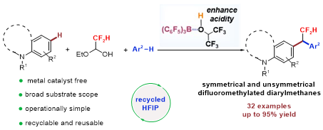 二芳基甲烷结构广泛存在于广谱抗菌剂甲氧苄啶(Trimethoprim, TMP)、抗病毒药物吡曲克辛(piritrexim)、治疗HIV感染的药物埃替拉韦(Elvitegravir)等多种药物分子中,向该结构中引入-CF2H基团受到化学工作者的高度关注。本研究针对以往二氟甲基化二芳基甲烷合成中存在的原子利用率低、反应困难以及需要使用高腐蚀性的强酸作为反应溶剂和活化试剂等问题,开发了基于HFIP–B(C6F5)3加合物协同催化的新反应策略,实现了芳胺骨架对称及非对称二氟甲基化二芳基甲烷的高效合成。该反应策略也适用于三氟甲基化及多氟芳基化二芳基甲烷的合成。反应过程操作简便,副产物仅为水和乙醇,反应溶剂也能够方便地回收再利用,在实现功能含氟化合物的绿色合成方面表现出了明显的优势。
