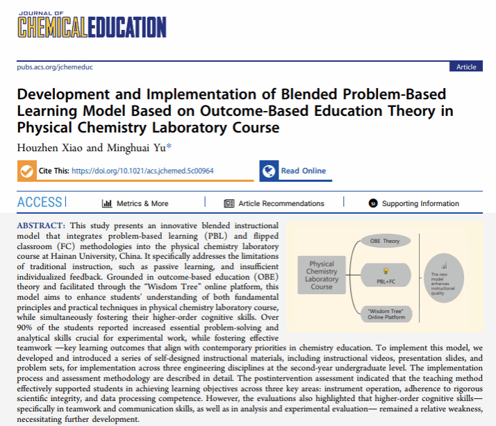 近日,yl7703永利集团基础化学实验教学中心的重要教学研究成果“Development and Implementation of Blended Problem-Based Learning Model Based on Outcome-Based Education Theory in Physical Chemistry Laboratory Course”(J. Chem. Educ. 2026, DOI:10.1021/acs.jchemed.5c00964)在美国化学会旗下的《Journal of Chemical Education》(JCE)上发表。基础化学实验教学中心肖厚贞老师为论文第一作者,永利集团为论文唯一通讯单位。