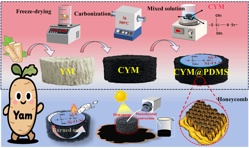随着海洋溢油事件频发及餐饮废油随意排放,高粘度油的回收已成为环境治理中的难题。传统油水分离方法效率低、成本高,且难以处理高粘度油类。为此,研究团队开发了一种基于农业产物山药的新型三维光热油水分离材料CYM@PDMS。该材料以山药为生物质碳源,经碳化其生物质衍生碳材料与聚二甲基硅氧烷疏水改性,构建出蜂窝状多孔结构,兼具优异的疏水性与高效光热转换性能。研究表明,CYM@PDMS的水接触角达141.51°,单次油水分离效率为97%,10次循环后仍保持在95–96%。在1.0 kW/m⟡光照下,材料表面温度可在240秒内升至78.2℃,光热转换效率达76.05%,对高粘度原油和火锅油的回收率最高可达78.41%。此外,材料还表现出良好的机械稳定性、化学稳定性和阻燃性能。